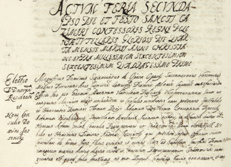 Z księgi radzieckiej Kazimierza obejmującej lata 1638–1641: wpis dokumentujący wybór rady urzędującej na rok 1641, z Andrzejem Jasowskim (nr 295) powołanym na miejsce w radzie zwolnione po śmierci Adama Gołąba – oraz zbliżenie zapisu imienia i urzędu (Archiwum Narodowe w Krakowie, sygn. K 40, s. 568)