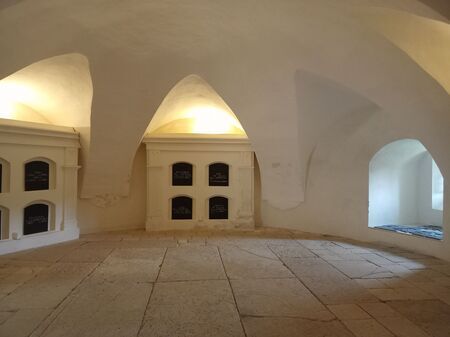 Reprodukcja wpisu do Złotej księgi miasta Podgórza; miejsce spoczynku Adama Stanisława Sapiehy w Baszcie Boskiej w Zespole Zamkowo-Parkowym w Krasiczynie (widok ogólny i zbliżenie tablicy nagrobnej).