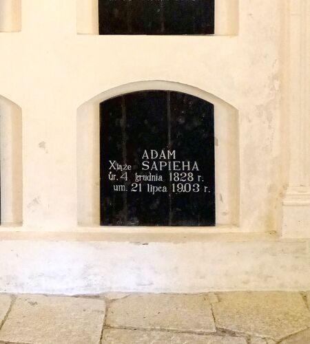 Adam Stanisław Sapieha-Kodeński z Krasiczyna, książę, herbu Lis, działacz społeczno-gospodarczy, polityk. Urodzony 4 grudnia 1828 r. w Warszawie, syn Leona Ludwika, marszałka sejmu galicyjskiego, i Jadwigi z Zamoyskich. Ukończył lwowskie gimnazjum, studiował w Londynie. W latach 1861, 1868–1872 i 1883–1895 poseł do Sejmu Krajowego Galicji. W 1879 r. odziedziczył po ojcu miejsce w wiedeńskiej Izbie Panów. W czasie powstania styczniowego po ucieczce z lwowskiego więzienia został komisarzem Rządu Narodowego na Francję i Anglię. W latach 1875–1899 piastował funkcję prezesa Galicyjskiego Towarzystwa Gospodarczego. W 1894 r. stanął na czele Komisji Wystawowej Powszechnej Wystawy Krajowej we Lwowie – przedsięwzięcia nowatorskiego i o dużym rozgłosie. Odznaczony m.in. Orderem Złotego Runa (rycerski order domu Habsburgów), wśród kilkunastu honorowych obywatelstw także lwowskie. W 1852 r. poślubił Jadwigę Klementynę, księżniczkę z Sanguszków, mieli siedmioro dzieci, wśród nich pierworodnego Władysława Leona, prapradziadka Matyldy, królowej Belgów, i najmłodszego Adama Stefana, kardynała metropolitę krakowskiego (por. s. 370–371). Zmarł 21 lipca 1903 r. w bawarskim Bad Reichenhall; pochowany w krypcie Sapiehów pod kaplicą zamkową w Krasiczynie.