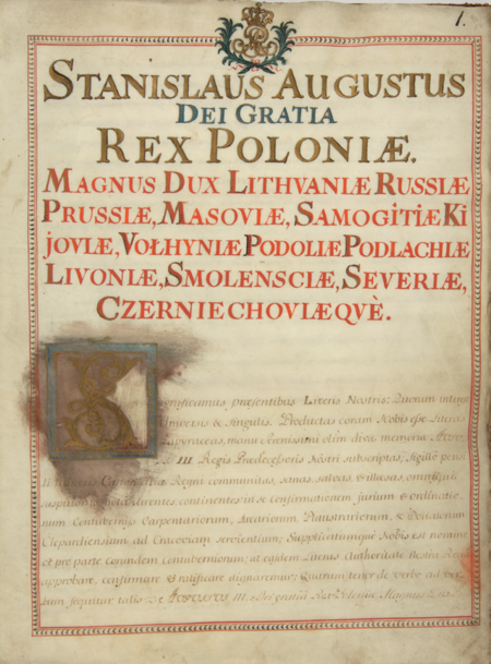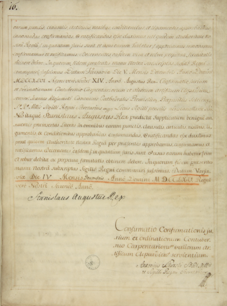 Pierwsza i ostatnia strona dokumentu wydanego w 1765 roku w Warszawie przez Stanisława Augusta Poniatowskiego, w którym potwierdzone zostały wcześniejsze akty zatwierdzające statut cechu stelmachów, stolarzy, bednarzy i kołodziejów kleparskich, w tym akt z 1683 roku wydany w Krakowie przez Jana III Sobieskiego, mocą którego król zatwierdził statut tego cechu, przyjęty wcześniej przez rajców miasta Kleparza pod przewodnictwem burmistrza Adama Tyczyńskiego– oraz zbliżenie zapisu imienia i funkcji (Archiwum Narodowe w Krakowie, sygn. perg. 836)