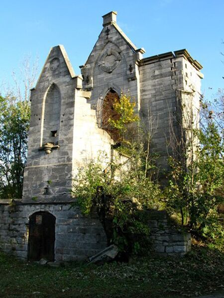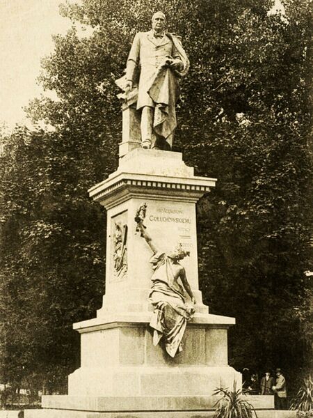 Fotografia pocztówkowa pomnika Agenora Gołuchowskiego w brązie, dłuta Cypriana Godebskiego mł., odsłoniętego w 1901 r. we Lwowie w obecnym parku im. Ivana Franki, zdemontowanego w roku 1950; miejsce spoczynku – ruiny kaplicy grobowej Gołuchowskich w Skale Podolskiej w Tarnopolskiem nad Zbruczem, obecnie na Ukrainie.