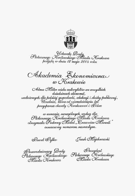 Srebrny medal nr 16 przyznany uchwałą Rady Miasta Krakowa nr XLVII/436/04 podjętą 12 maja 2004 r., gdy urząd prezydenta miasta pełnił Jacek Majchrowski, a Radzie przewodniczył Paweł Pytko. Uhonorowanie to nastąpiło w jubileusz 80-lecia otwarcia w Krakowie Wyższego Studium Handlowego. Wręczenie medalu wraz z dyplomem nastąpiło 5 czerwca 2004 r. podczas uroczystej sesji Rady Miasta Krakowa w sali Obrad RMK w Pałacu Wielopolskich w Krakowie, co uwieczniono w Księdze Medalu „Cracoviae Merenti”.