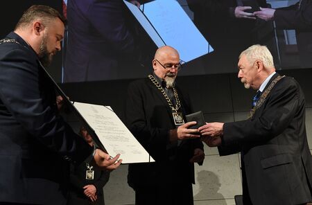 Wręczenie przez prezydenta miasta i przewodniczącego RMK medalu i dyplomu do rąk rektora ASP prof. Andrzeja Bednarczyka; prezentacja przez rektora ASP symboli uhonorowania.