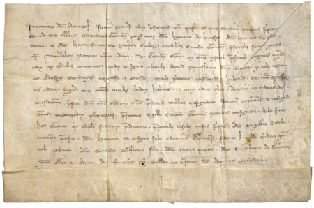 Jednym z działań urzędowych wójta było poświadczanie czynności prawnych. Tu akt poświadczający transakcję dokonaną przez Jana Muskatę, biskupa krakowskiego – oraz powiększenie fragmentu z zapisem imienia i urzędu (Archiwum Krakowskiej Kapituły Katedralnej, sygn. Dp 83)