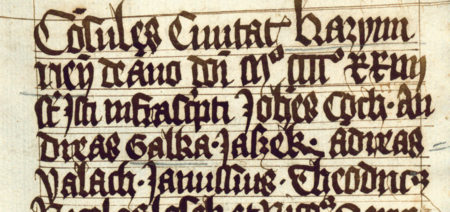 Z księgi radzieckiej Kazimierza obejmującej lata 1416–1433: fragment wpisu dokumentującego wybór rajców na rok 1424, z Andrzejem Gałką w składzie – oraz zbliżenie zapisu imienia (Biblioteka Jagiellońska, sygn. rkps 1045/2, k. 121)