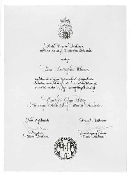 …w dowód uznania Jego szczególnych zasług… (z uchwały Rady Miasta Krakowa nr LIX/1735/21) |