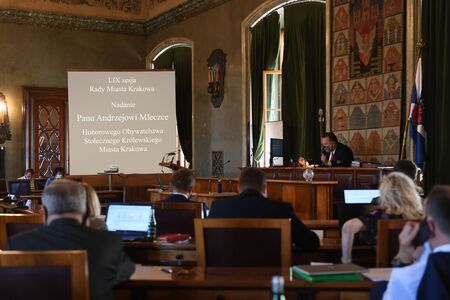 Widok Sali Obrad RMK w Pałacu Wielopolskich podczas sesji Rady 9 czerwca 2021 r., w chwili rozpatrywania wniosku o nadanie Andrzejowi Mleczce honorowego obywatelstwa Krakowa, o czym informacja na ekranie w głębi (na sali tylko przedstawiciele klubów radnych, uczestnictwo pozostałych radnych zdalne, zgodnie z rygorami obowiązującymi w czasie trwania pandemii koronawirusa SARS-CoV-2); po prawej stronie reprodukcja przygotowanego dyplomu honorowego obywatelstwa Andrzeja Mleczki, pozostającego ze względu na pandemię w oczekiwaniu na wręczenie uhonorowanemu w terminie umożliwiającym zwołanie uroczystej sesji Rady Miasta Krakowa.