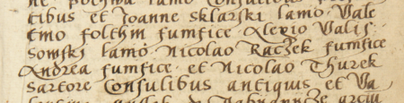 Z księgi radzieckiej Kleparza obejmującej lata 1539–1546: wpis z 1539 roku dokumentujący wybór rady urzędującej wraz z odnotowaniem rajców starych, wśród których znajduje się Andrzej powroźnik – oraz zbliżenie zapisu imienia (Archiwum Narodowe w Krakowie, sygn. KL 24, s. 1)