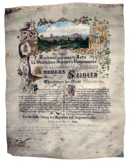Tytuł nadany na posiedzeniu Magistratu i Wydziału Miejskiego 4 listopada 1858 r. (dokument nie zachował się), gdy burmistrzem miasta był sam uhonorowany Andrzej Seidler – to jedyny krakowski przypadek, aby głowa miasta otrzymała ten honorowy tytuł w trakcie trwania urzędowania. Dyplom został przekazany 1 stycznia 1859 r. przez delegację pod przewodnictwem starszego Wydziału Miejskiego Ludwika Helcla z udziałem członków Wydziału Józefa Bartla, Józefa Jakubowskiego, Kaspra Pollera, Walerego Wielogłowskiego i Wincentego Wolfa.
