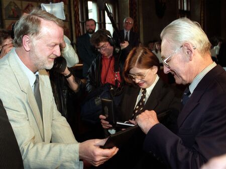Z uroczystości wręczenia medalu i dyplomu 26 kwietnia 1995 r. w Pałacu Wielopolskich. Andrzej Wajda i Krystyna Zachwatowicz-Wajda prezentują medal.