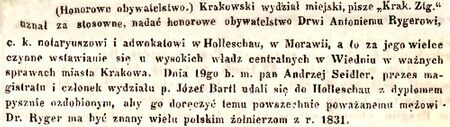…za wielce czynne wstawianie się u wysokich władz centralnych w Wiedniu w ważnych sprawach miasta Krakowa… (z notatki w dzienniku „Gazeta Lwowska” z 1863 r., nr 91) |