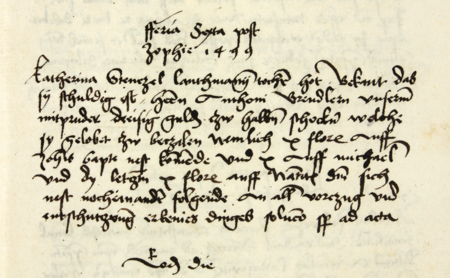 Z księgi radzieckiej obejmującej lata 1483–1500 fragment strony 559 z wpisem z 1499 roku stwierdzającym, że w piątek po św. Zofii córka Stenczila Katarzyna zeznała przed radą miejską, iż jest winna rajcy Antoniemu Brendlerowi 30 florenów, określając jednocześnie terminy spłaty – oraz powiększenie zapisu imienia (Archiwum Państwowe w Krakowie, sygn. rkps 430, s. 559)