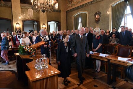Duplikat dyplomu honorowego obywatelstwa oraz prezentacja jego oryginału przez uhonorowanego; Antoni Dziatkowiak z małżonką Hanną, także profesorem medycyny.