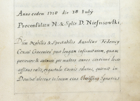 Z urzędowego spisu rajców obejmującego lata 1363–1802 fragment strony 51 z wpisem z 1718 roku o wyborze do rady miejskiej nowego rajcy Ignacego Pawła Michałowskiego (nr 592), jak zapisano: „po śmierci szlachetnego i czcigodnego Aureliusza Federiciego, zmarłego po długiej i ciężkiej chorobie, którą znosił cierpliwie, przykuty przez wiele lat do łoża” – oraz powiększenie zapisu imienia (Archiwum Państwowe w Krakowie, sygn. rkps 1477, s. 51)