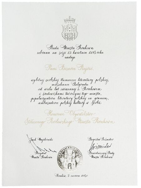…popularyzatorce literatury polskiej za granicą, ambasadorce polskiej kultury w Serbii, w dowód uznania Jej szczególnych zasług… (z uchwały Rady Miasta Krakowa nr C/2583/18) |