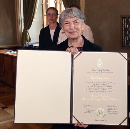 Tytuł nadany uchwałą Rady Miasta Krakowa nr C/2583/18 podjętą 25 kwietnia 2018 r., gdy urząd prezydenta miasta pełnił Jacek Majchrowski, a Radzie przewodniczył Bogusław Kośmider. Nadanie to nastąpiło w 50-lecie związków uhonorowanej z krakowskimi środowiskami naukowców, literaturoznawców, teatrologów i literatów. Wręczenie dyplomu miało miejsce 5 czerwca 2018 r. podczas uroczystej sesji Rady Miasta Krakowa w Sali Obrad RMK im. Stanisława Wyspiańskiego w Pałacu Wielopolskich w Krakowie. Duplikat dyplomu zdeponowany został w Muzeum Krakowa.