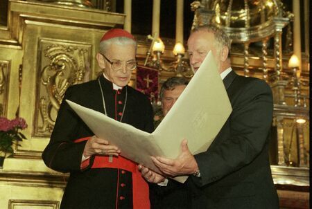 Z uroczystości wręczenia medalu z dyplomem 12 maja 2000 r. w katedrze na Wawelu. Wystąpienie abp. metropolity krakowskiego kard. Franciszka Macharskiego oraz herb biskupstwa krakowskiego.