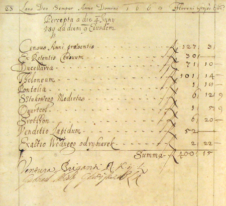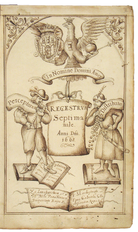 Z księgi miejskiej rachunkowej obejmującej rok 1668 strona tytułowa i fragment strony 54 z zestawieniem dochodów miasta, kiedy to funkcję lonera pełnił Bonawentura Briganti – oraz powiększenie jego podpisu pod zestawieniem (Archiwum Państwowe w Krakowie, sygn. rkps 2066, s. 54)