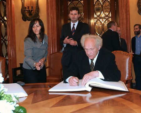 Z uroczystości wręczenia medalu z dyplomem 5 czerwca 2005 r. w Pałacu Wielopolskich. W sali Obrad RMK Bronisław Chromy prezentujący medal oraz własnoręczny podpis uhonorowanego.