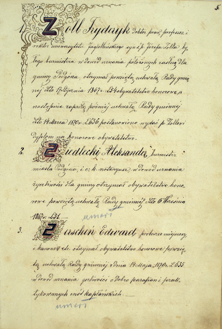 zwierzchZ akt zawierających kontrakty gminy Podgórze obejmujące lata 1835–1885: dokument z 1868 roku zatwierdzający na podstawie stosownej uchwały rady gminnej, potwierdzonej przez Wydział Krajowy w Lwowie, kontrakt zawarty między miastem a Janem Böhmem – oraz zbliżenie podpisu i pieczęci miejskiej (Archiwum Narodowe w Krakowie, sygn. P 43, s. 147)Z założonej w 1867 roku Księgi [Książki] Obywateli Miasta Podgórza, uwieczniającej wszystkie honorowe obywatelstwa Podgórza oraz niektóre zwykłe obywatelstwa miejskie: przód okładziny i strona z pierwszymi wpisami – oraz zbliżenie wpisu honorującego Aleksandra Siedleckiego (Archiwum Narodowe w Krakowie, sygn. P 33, okładzina i s. 5)