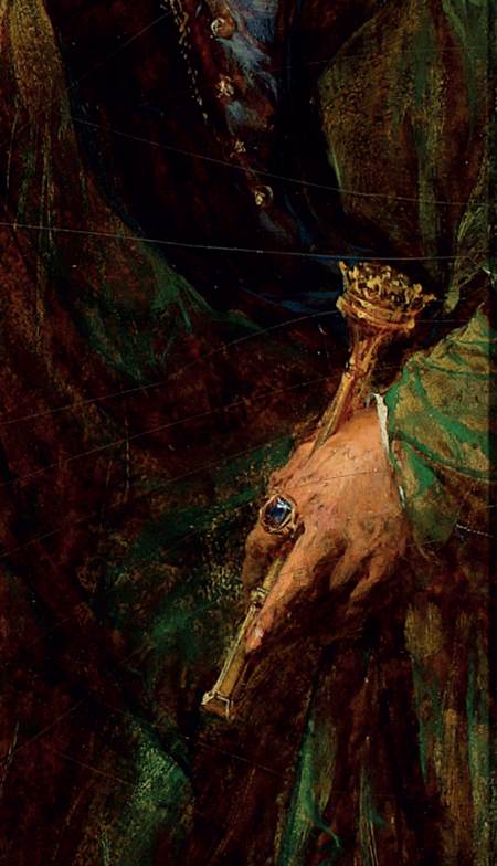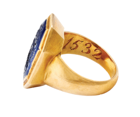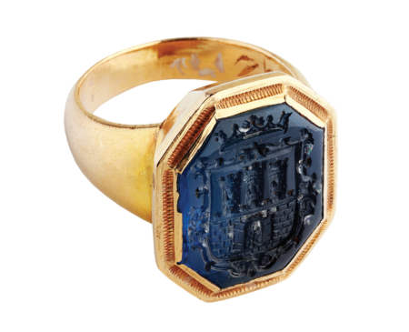 Takich pytań nie stawiamy w odniesieniu do pierścienia (sygnetu) krakowskich burmistrzów. Został wykonany ze złota w 1532 r., z szafirowym okiem, które w roku 1590 – jak zaświadczają miejskie regestry – został wymieniony. Jest opisany we wspomnianym urzędowym inwentarzu insygniów burmistrzowskich z 1679 r., tam też jest mowa o obyczaju przekazywania go między burmistrzem ustępującym a burmistrzem nowo wybranym (zob. il. 433). Sercem tego pierścienia jest sygnetowa pieczęć w kształcie herbu Krakowa, wyryta w szafirze (zob. il. 434–435). Jest to jedno z pierwszych