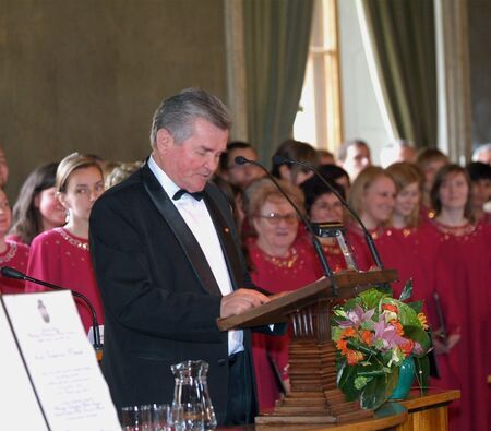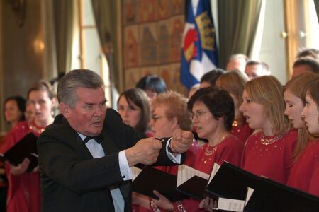 Z uroczystości wręczenia medalu z dyplomem 5 czerwca 2008 r. w Pałacu Wielopolskich. Wystąpienie w Sali Obrad RMK dyrygenta i kierownika artystycznego Chóru Mariańskiego Jana Rybarskiego oraz logo laureata.