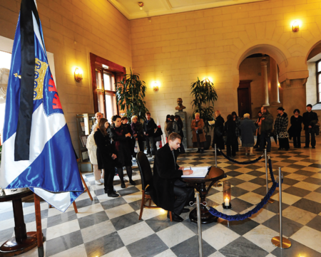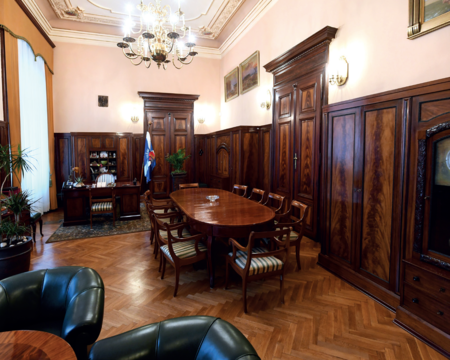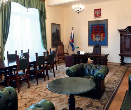 I oto ostatni krok: wykonano dwa egzemplarze chorągwi miasta Krakowa i 4 sierpnia 2004 r. w gabinetach prezydenta miasta oraz przewodniczącego Rady Miasta Krakowa zainstalowano po jednym egzemplarzu – to ich stałe miejsce (zob. il. 152–153), stąd są wyprowadzanie czy to na Salę Obrad Rady Miasta Krakowa, czy incydentalnie do holu w Pałacu Wielopolskich, czy też na zewnątrz, na uroczystości obywające się na terenie miasta (zob. il. 154 oraz il. 161).