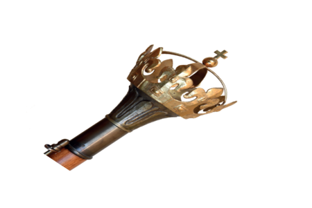 2. Chorągiew sporządzona zostaje wg wzoru określonego w uchwale, o której mowa w § 1 ust. 1 i jest umieszczona na drzewcu zwieńczonym miniaturą korony używanej przy koronacjach polskich monarchów.