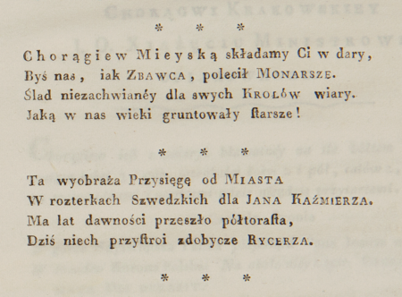 Szukając historycznych śladów chorągwi miejskiej, przywołajmy adres (uroczyste pisemne wystąpienie) złożony przez władze miasta w imieniu krakowian na ręce księcia Józefa Poniatowskiego w 1809 r. W adresie tym mowa o przekazaniu księciu liczącej ponad 150 lat chorągwi miejskiej, sprawionej w roku 1649 w związku z koronacją Jana Kazimierza i składaniem należnego królowi hołdu oraz przysięgi wierności od miasta i mieszczan (il. 145–147).
