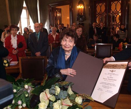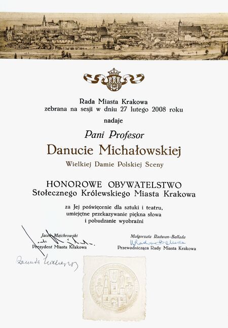 Z uroczystego wręczenia dyplomu honorowego obywatelstwa 16 kwietnia 2008 r. w Pałacu Wielopolskich. Danuta Michałowska w Sali Obrad RMK oraz własnoręczny podpis uhonorowanej.