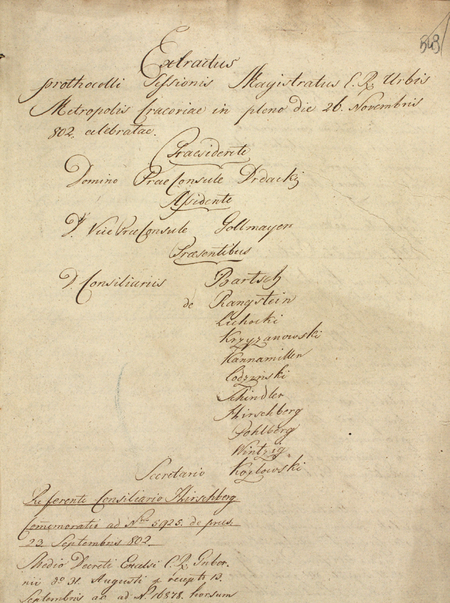 Z akt magistratu miasta Krakowa 1796–1816 skład magistratu zanotowany w protokole z posiedzenia 26 listopada 1802 roku, z Dominikem Drdatzkim jako prezydentem miasta na czele – oraz powiększenie zapisu imienia i urzędu prezydenckiego (Archiwum Państwowe w Krakowie, sygn. Mag. I 52, s. 549)