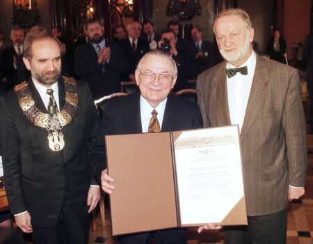 Duplikat dyplomu honorowego obywatelstwa oraz prezentacja oryginału przez Edwarda J. Moskala w obecności prezydenta miasta i przewodniczącego Rady.