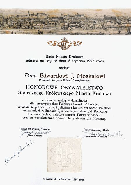 Z uroczystości wręczenia dyplomu honorowego obywatelstwa 6 kwietnia 1997 r. w Pałacu Wielopolskich. Edward J. Moskal podczas wystąpienia w sali Obrad RMK oraz własnoręczny podpis uhonorowanego.