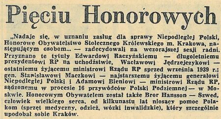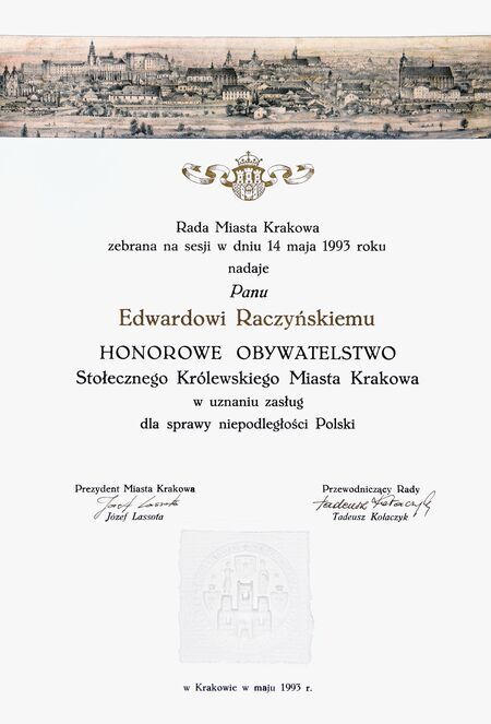 …w uznaniu zasług dla sprawy niepodległości Polski… (z uchwały Rady Miasta Krakowa nr LXXXII/532/93) |