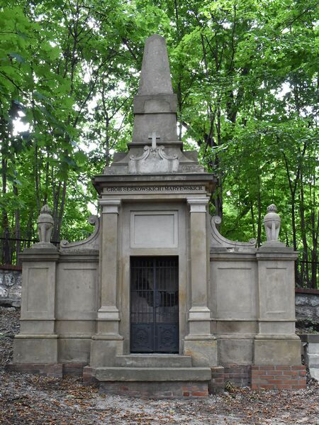 Reprodukcja wpisu do Złotej księgi miasta Podgórza; niżej miejsce spoczynku – grobowiec rodzinny Serkowskich i Maryewskich na cmentarzu Podgórskim starym w Krakowie (por. s. 355).