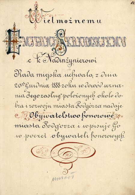 tytuł honorowego obywatela podgórza nadany 20 grudnia 1888 roku |