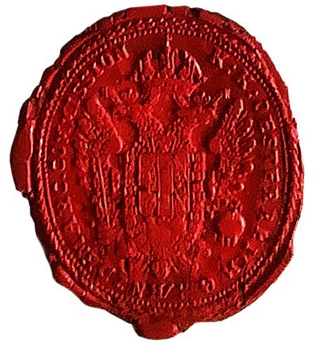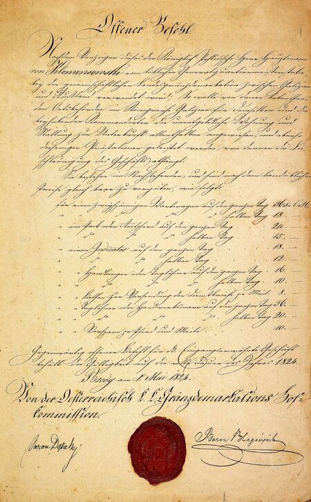 Reprodukcja pisemnego rozkazu wydanego przez Emmericha von Blagoevicha w 1824 r. w ramach prac nad demarkacją między Austrią i Królestwem Polskim oraz odcisk w laku pieczęci urzędowej, którą posługiwał się Emmerich von Blagoevich podczas tych prac.