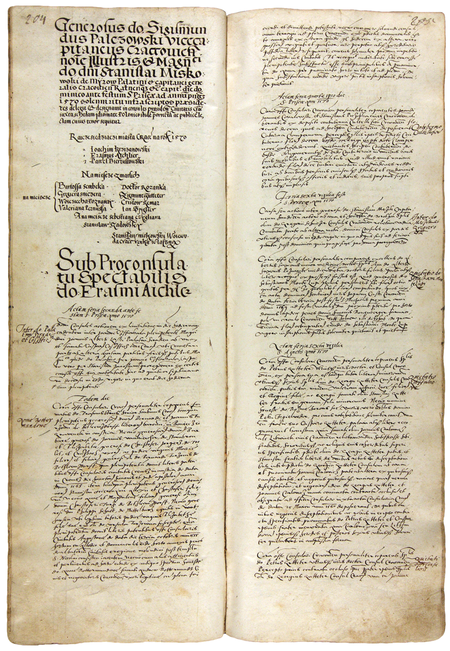 Z księgi radzieckiej obejmującej lata 1567–1576 strony 204–205 z tytułem otwierającym wpisy spraw prowadzonych za kadencji burmistrzowskiej Erazma Aichlera w 1570 roku – oraz powiększenie zapisu imienia i funkcji burmistrza (Archiwum Państwowe w Krakowie, sygn. rkps 446, s. 204–205)