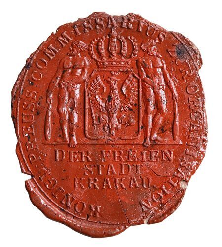 Fragment wpisu do Księgi obywatelskiej… WMK; obok dwa odciski w laku pieczęci Reibnitza: osobistej herbowej oraz urzędowej jako pruskiego komisarza ds. organizacji WMK;