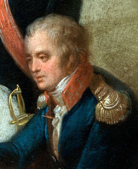 Portret Ernesta Wilhelma von Reibnitza wykadrowany z obrazu Maksymiliana Cerchy Nadanie konstytucji Wolnemu Miastu Krakowowi z 1818 r. oraz własnoręczny podpis uhonorowanego)