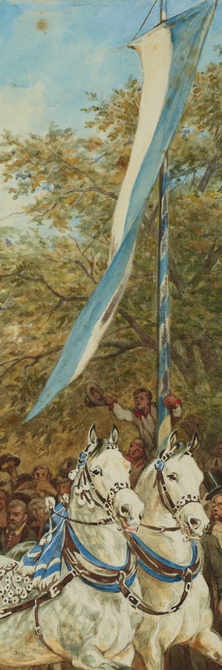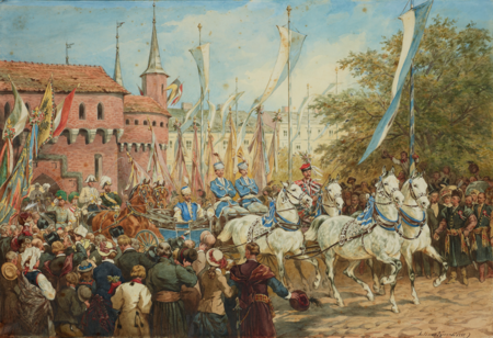 (164–165) Z cyklu Podróż inspekcyjna cesarza Franciszka Józefa I po Galicji we wrześniu 1880 r. akwarela Juliusza Kossaka z 1880 r. Wjazd cesarza Franciszka Józefa do Krakowa w 1880 r. – w pierwszym powozie prezydent Mikołaj Zyblikiewicz w stroju staropolskim, w drugim – cesarz; miasto oficjalnie udekorowano m.in. biało-błękitnymi flagami Krakowa (MNK, nr inw. III-r.a-12774)