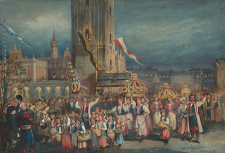 (166–167) Z cyklu Podróż inspekcyjna cesarza Franciszka Józefa I po Galicji we wrześniu 1880 r. akwarela Tadeusza Ajdukiewicza z 1881 r. Pochód dożynkowy ludu krakowskiego na Rynku Głównym w Krakowie – widoczne flagi: biało-błękitna miasta Krakowa, czarno- żółta cesarska Habsburgów i biało-czerwona – władze austriackie przyjmowały amarant i biel jako „barwy narodowe Polaków” (MNK, nr inw. III-r.a-12776)