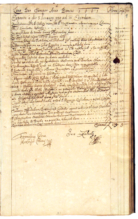 Z księgi miejskiej rachunkowej obejmującej rok 1661 przód okładziny i strona 9 z zestawieniem bieżących wydatków ponoszonych przez miasto, gdy funkcję lonera pełnił Jan Zaleski (nr 536) – oraz powiększenie podpisu burmistrza Franciszka Cyrusa, kontrolującego rachunki lonera (Archiwum Państwowe w Krakowie, sygn. rkps 2062, s. 9)