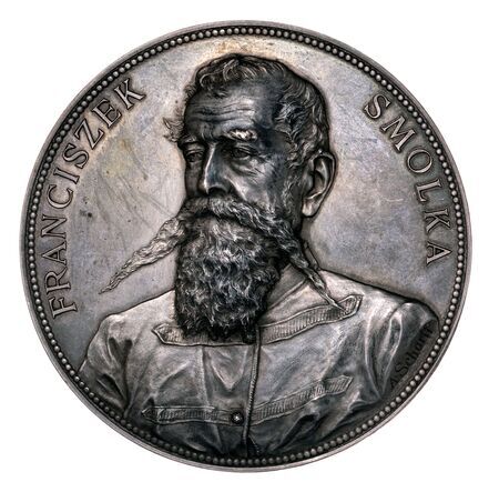 Litografia Eduarda Kaisera z 1861 r. prezentująca postać uhonorowanego w stroju staropolskim i awers medalu o średnicy 65 mm wybitego według projektu Antona Scharffa w 1895 r. przez Radę Miasta Lwowa w 85-lecie urodzin Franciszka Jana Smolki;