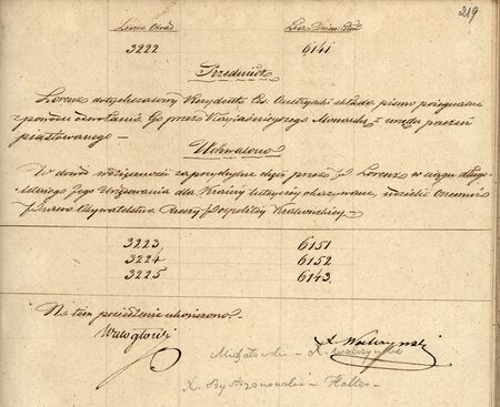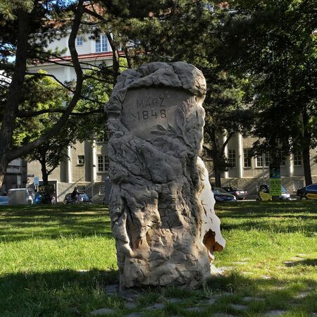 Z protokołów obrad Senatu WMK reprodukcja wpisu z uchwałą przyznającą godność; odcisk w laku pieczęci urzędowej Franciszka Lorenza, rezydenta cesarza Austrii przy WMK, oraz pomnik ofiar wiedeńskiej Wiosny Ludów 1848 r. – symboliczna pozostałość na terenie zlikwidowanego cmentarza Schmelzer Friedhof w Wiedniu, na którym pochowany został Franciszek Lorenz.