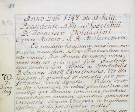 Z urzędowego spisu rajców obejmującego lata 1363–1802 fragment strony 84 z wpisem z 1747 roku o wyborze do rady miejskiej Kristiana Józefa Junglinga (nr 616), gdy zmarł rajca Jan Jerzy Karli (nr 590), co działo się, gdy burmistrzem był Franciszek Soldadini – oraz powiększenie zapisu imienia funkcji (Archiwum Państwowe w Krakowie, sygn. rkps 1477, s. 84)