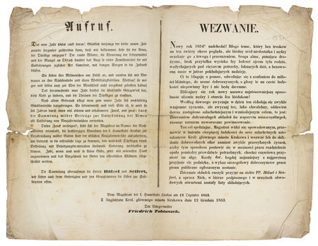 Z akt Magistratu Miasta Krakowa ogłoszenie publiczne z grudnia 1853 roku z wezwaniem do mieszkańców, aby w miejsce wysyłania noworocznych powinszowań zasilali fundusz dla ubogich, podpisane przez burmistrza Fryderyka Tobiaszka – oraz powiększenie zapisu imienia i urzędu (Archiwum Państwowe w Krakowie, sygn. Mag II 459, s. 1550–1551)
