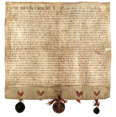 Akt lokacji Krakowa na prawie magdeburskim wydany przez Bolesława Wstydliwego w 1257 roku w Koperni z zapisem dotyczącym ustanowienia wójtów dziedzicznych nowego miasta – oraz powiększenie fragmentu z zapisem imienia (Archiwum Państwowe w Krakowie, sygn. perg. 2)
