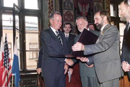 Z uroczystości wręczenia dyplomu honorowego obywatelstwa 20 lipca 1995 r. w Pałacu Wielopolskich. George H.W. Bush w sali Obrad RMK oraz własnoręczny podpis uhonorowanego.