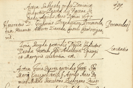 Z księgi radzieckiej Kazimierza obejmującej protokoły spraw z 1645 roku: wpis przekazania funkcji burmistrza miasta przez rajcę Grzegorza Drążkowicza w ręce rajcy Wojciecha Zawady starszego (nr 298) – oraz zbliżenie zapisu imienia i funkcji (Archiwum Narodowe w Krakowie, sygn. K 91, s. 179)